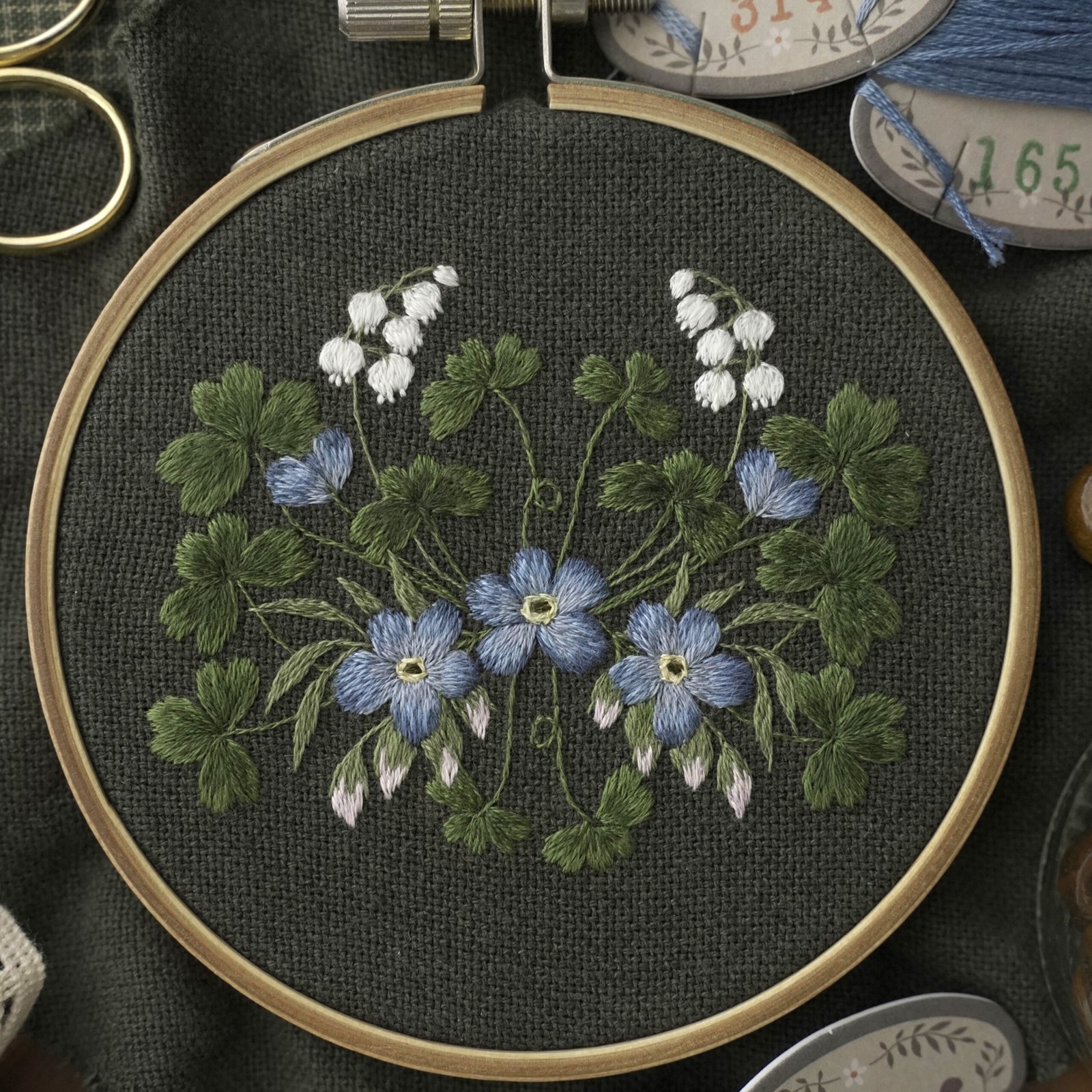 這次繡了鈴蘭花、勿忘我、還有三葉草,全都是春夏季節的花朵,組合起來像一個小小的花園。